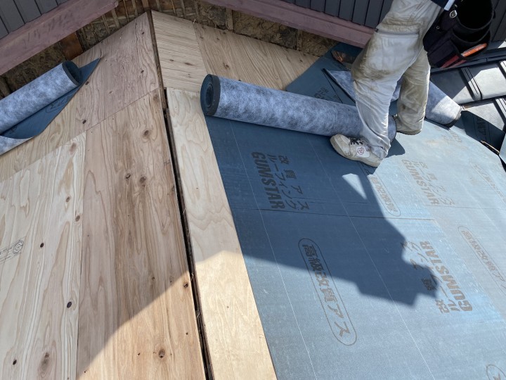 防水シートを貼り、新しい屋根を乗せる準備をします。