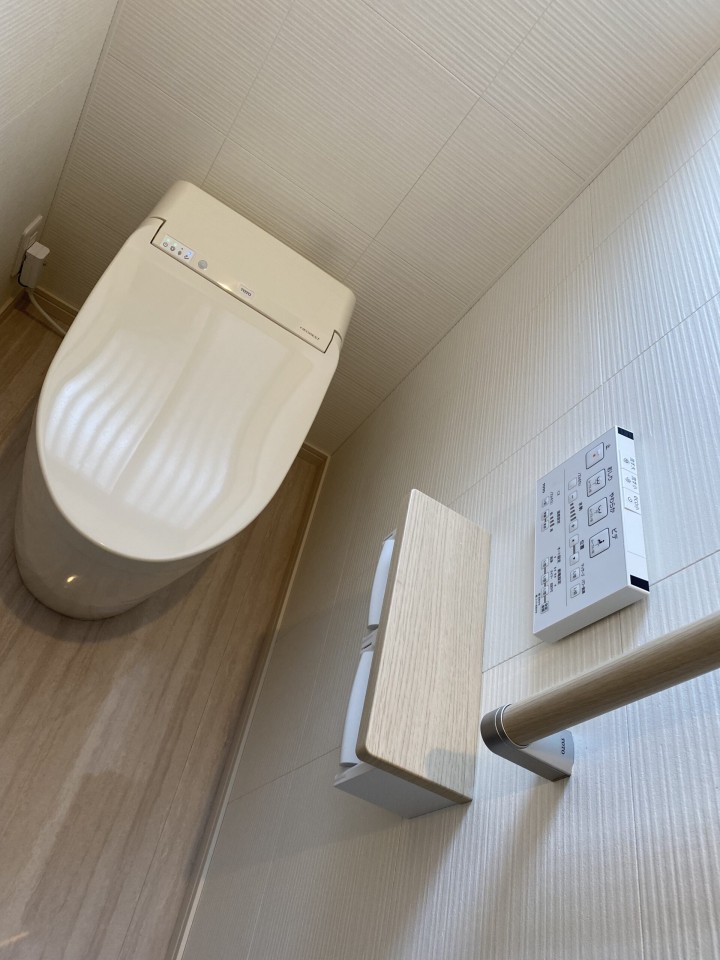 白色を基調としたシンプルな感じのおトイレとなりましたが、壁材・床材・天井材と材質にこだわったトイレリフォームをさせて頂きました。毎日必ず使う場所として、少しでも、手がかからないように、心地良い空間になるように、また日々考えて行きたいと思います。お客様のおばあさまは、ご高齢なので、立ち上がりも楽なように手すりもつけました。小さなトイレという空間ですが、お客様にとって心地良い空間となりますように・・・