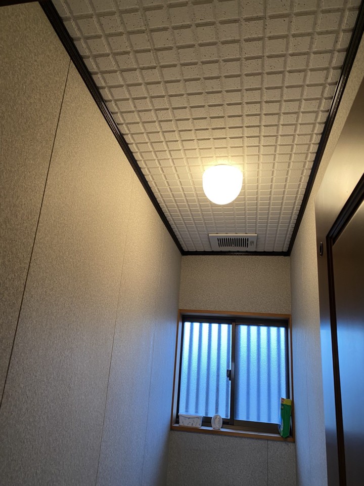今回のお客様のご要望により、トイレ空間でも、匂いを気にしたり出来る限り無くしたいとのご希望でした。DAIKEN様の商品である調室壁材さらりあーとを使用してみました。呼吸する壁として、健やかな空気環境を得ることが出来ます。防汚性能にも優れており、シミや汚れが付きにくくなっています。壁に続き、天井もDAIKEN様の天井材を使いました。音や湿気、臭いも抑えられます。DAIKEN様の壁材だけではなく、天井材にも色々あります。