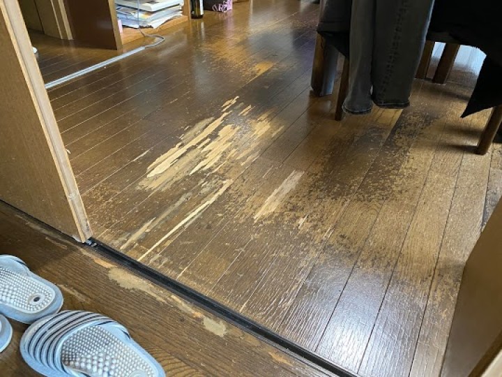 築24年余りのダイニングのフローリングが傷が目立つようになりましたので、フロアタイル施工を行いました。