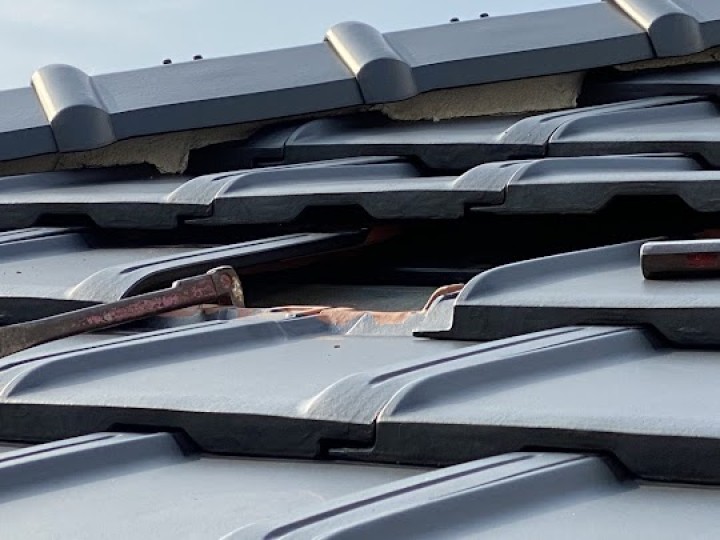 今回は割れた瓦を直します。①割れた瓦を全部割って撤去します。②新しい瓦を差し込んで完成です。って言葉で書くととても簡単そうですが勾配のある屋根での危険作業で専門の知識が必要な工事です。必ず専門業者へご依頼ください。